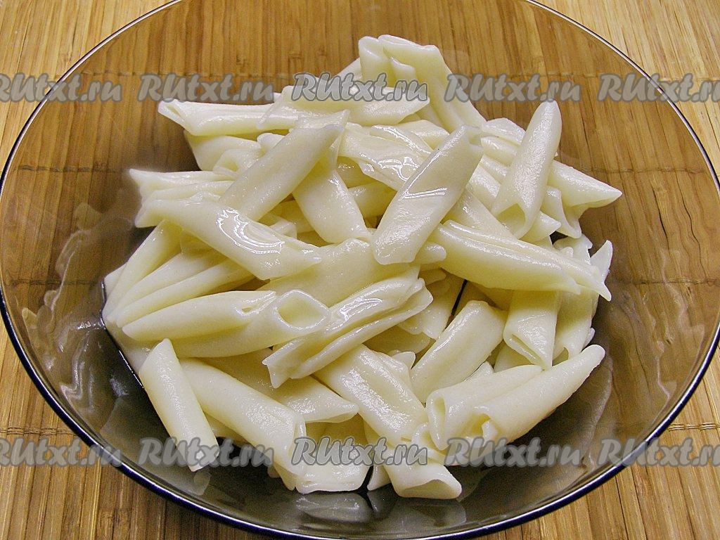Макароны выкладываем в кастрюлю с кипящей чуть подсоленной водой, даём закипеть, а затем на умеренном огне отвариваем до готовности (на это потребуется минут 7-8 после закипания, более точно время варки можно посмотреть в инструкции на упаковке макаронных изделий, которые вы варите). Затем воду сливаем через дуршлаг, в макароны добавляем 1 столовую ложку растительного масла, перемешиваем и оставляем немного остыть.
