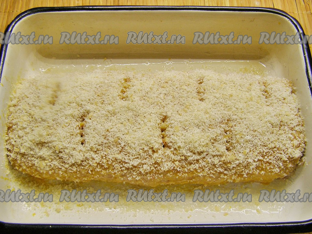 Посыпаем рулет панировочными сухарями и вилкой делаем сверху несколько проколов для выхода пара. Ставим рулет в прогретую до 180 градусов духовку и запекаем, примерно, 30-40 минут.