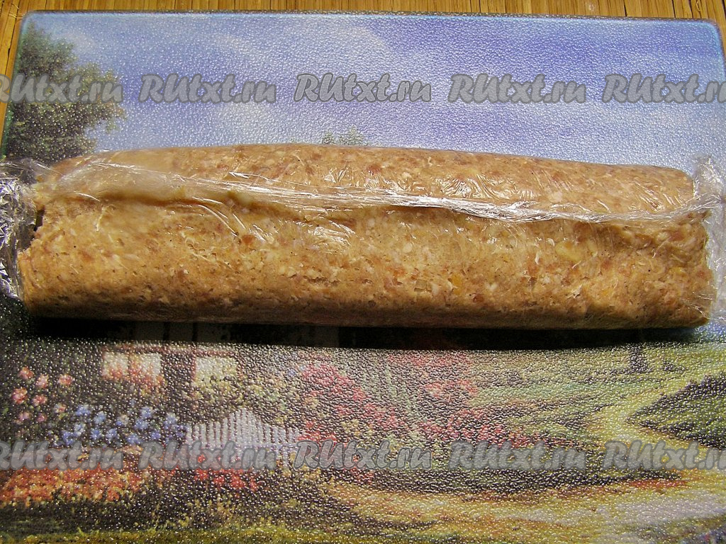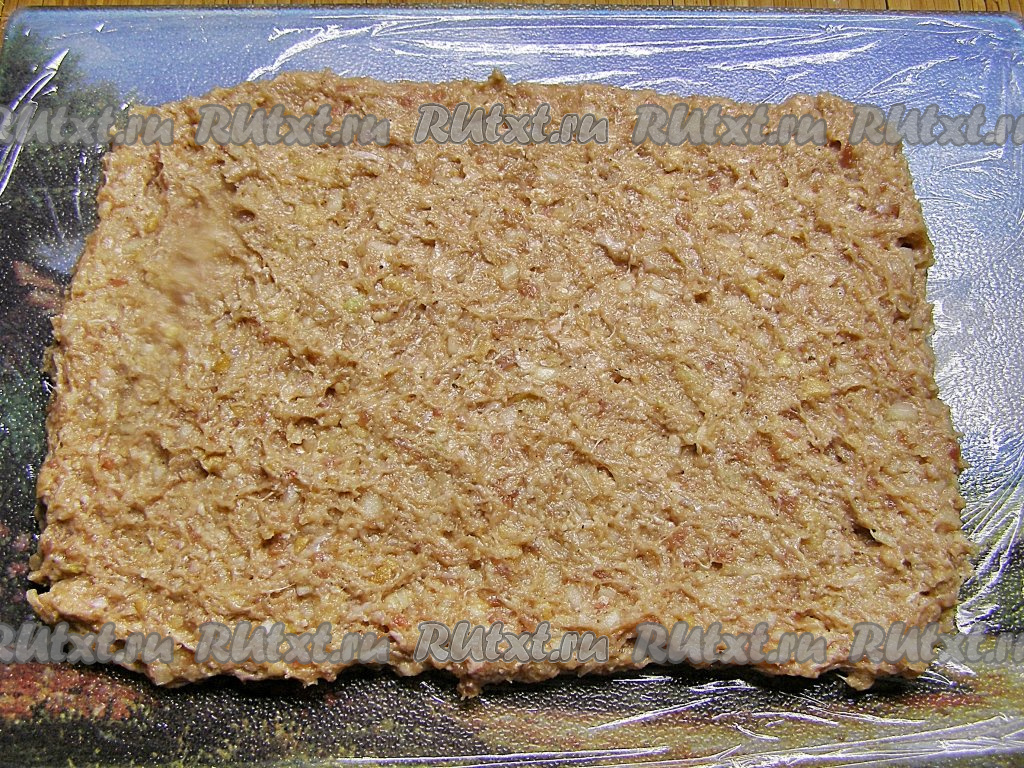 Доску (или стол) застилаем пищевой плёнкой и выкладываем на неё фарш. Разравниваем его руками, придавая форму прямоугольника размером, примерно, 17 сантиметров на 25 сантиметров и толщиной около 1,5 сантиметров.