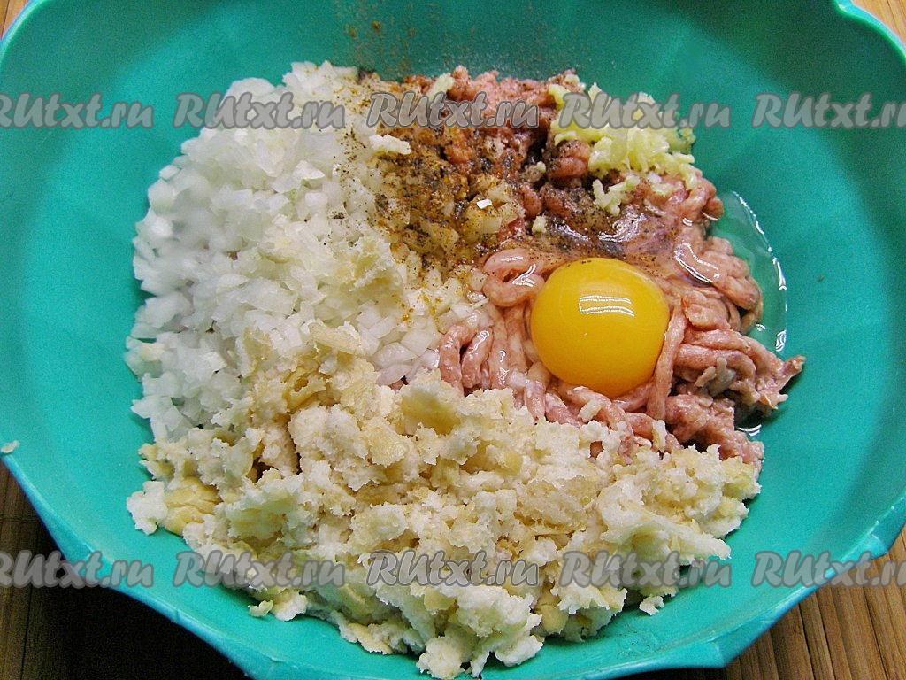 Фарш для приготовления рулета можно взять покупной, но лучше для получения фарша пропустить кусочки мяса (я взяла кусочки говядины и свинины) через мясорубку. Очищенную луковицу тоже пропускаем через мясорубку (или очень мелко нарезаем). Белый хлеб замачиваем на несколько минут в воде, затем хорошо его отжимаем от лишней жидкости, пропускаем через мясорубку (или хорошо разминаем руками). В миску с фаршем выкладываем подготовленные лук и хлеб, добавляем яйцо, соль, измельчённый через пресс чеснок, всыпаем по вкусу молотые красный и чёрный перцы. Хорошо перемешиваем фарш и немного отбиваем его об миску (просто поднимаем и несколько раз бросаем фарш в миску - благодаря отбиванию, связующие свойства фарша усилятся и рулет будет лучше держать форму).