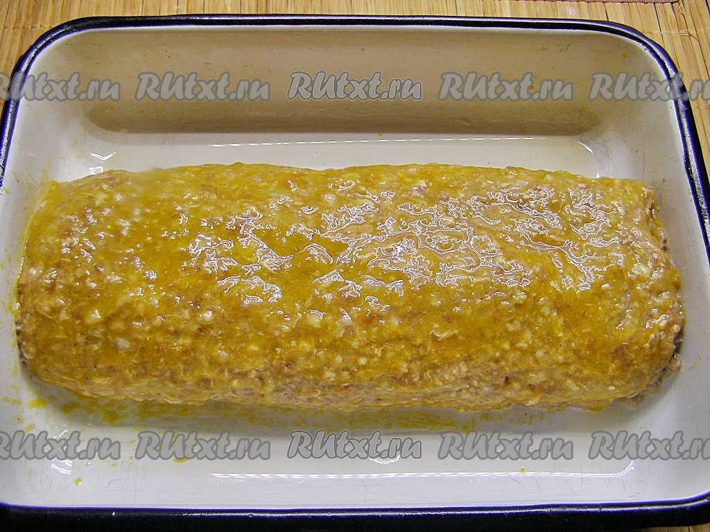Не снимая плёнку, переносим рулет в смазанную маслом форму для запекания (или на противень), затем аккуратно достаём плёнку из-под рулета. Смазываем верх и бока рулета взбитым желтком.