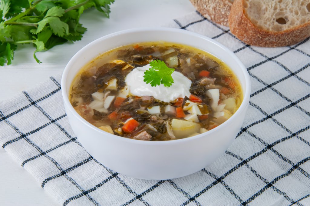 Аппетитный, сытный зелёный борщ, сваренный со щавелем и яйцами, можно разливать по тарелкам и подавать на стол. Я подала со сметаной, блюдо получилось ещё более полезным и вкусным!