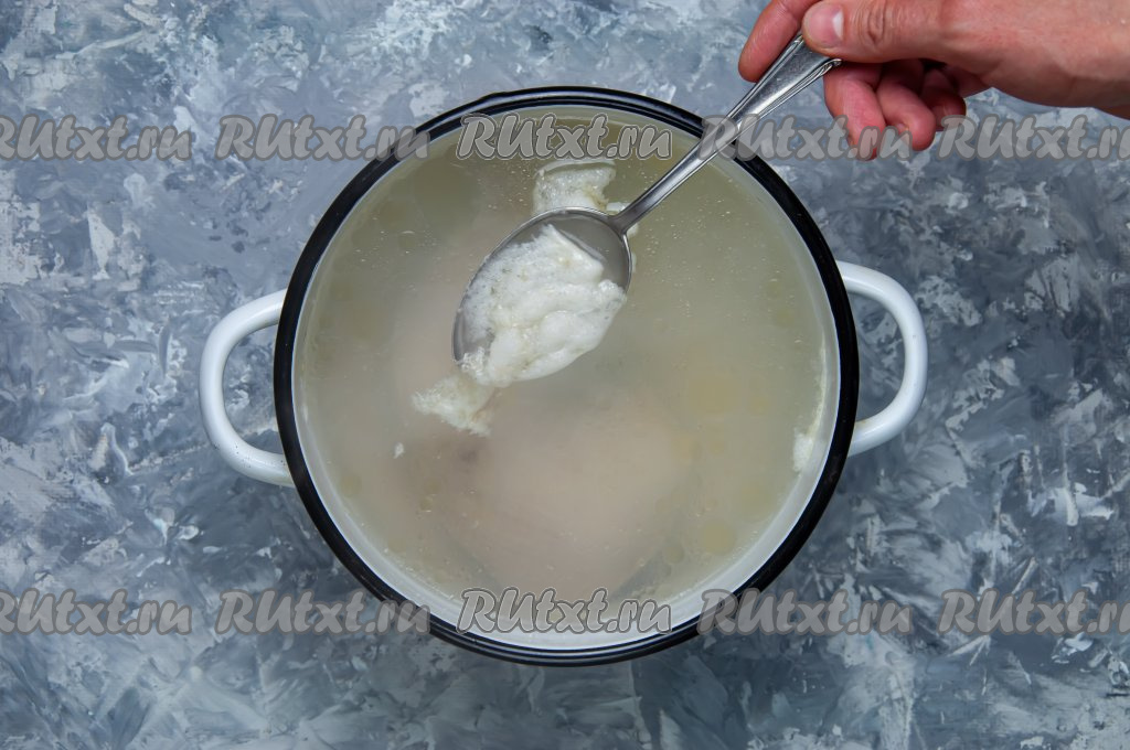 В процессе закипания появится пенка, уберите её ложкой. Варите мясной бульон около 45 минут с момента закипания на небольшом огне.