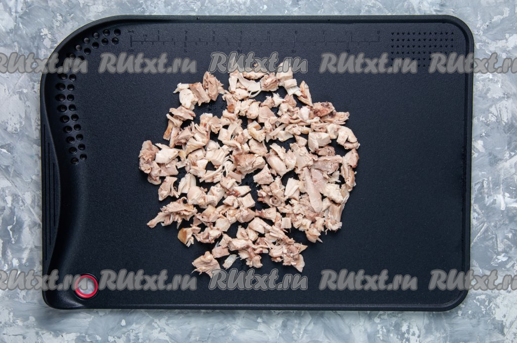 Выньте сваренное куриное мясо из кастрюли и остудите. Отделите филе от костей, удалите кожу и нарежьте на кусочки. Положите нарезанную курицу назад в бульон.