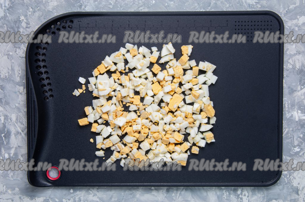 В отдельной ёмкости сварите яйца вкрутую (варим 9-10 минут с момента закипания воды). Остудите их, почистите, нарежьте на небольшие кубики.