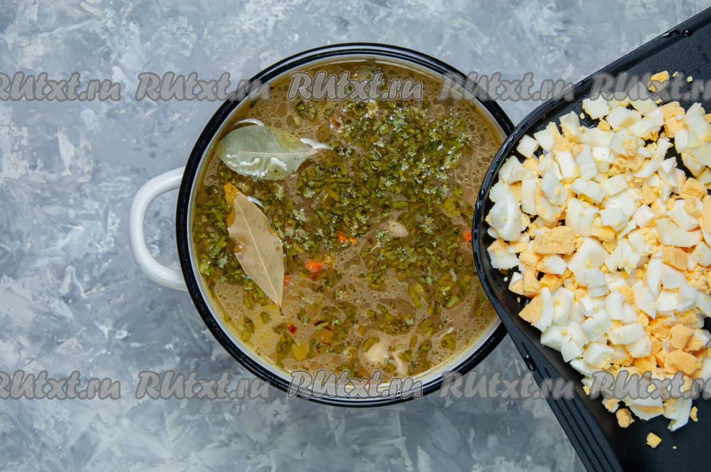 Когда картофель будет готов (станет достаточно мягким), добавьте в кастрюлю обжаренные овощи, нарезанные яйца, лавровый лист, щавель и зелень, посолите зелёный борщ и поперчите по вкусу, доведите до кипения, а затем дайте провариться ещё 5 минут на среднем огне и выключайте огонь.