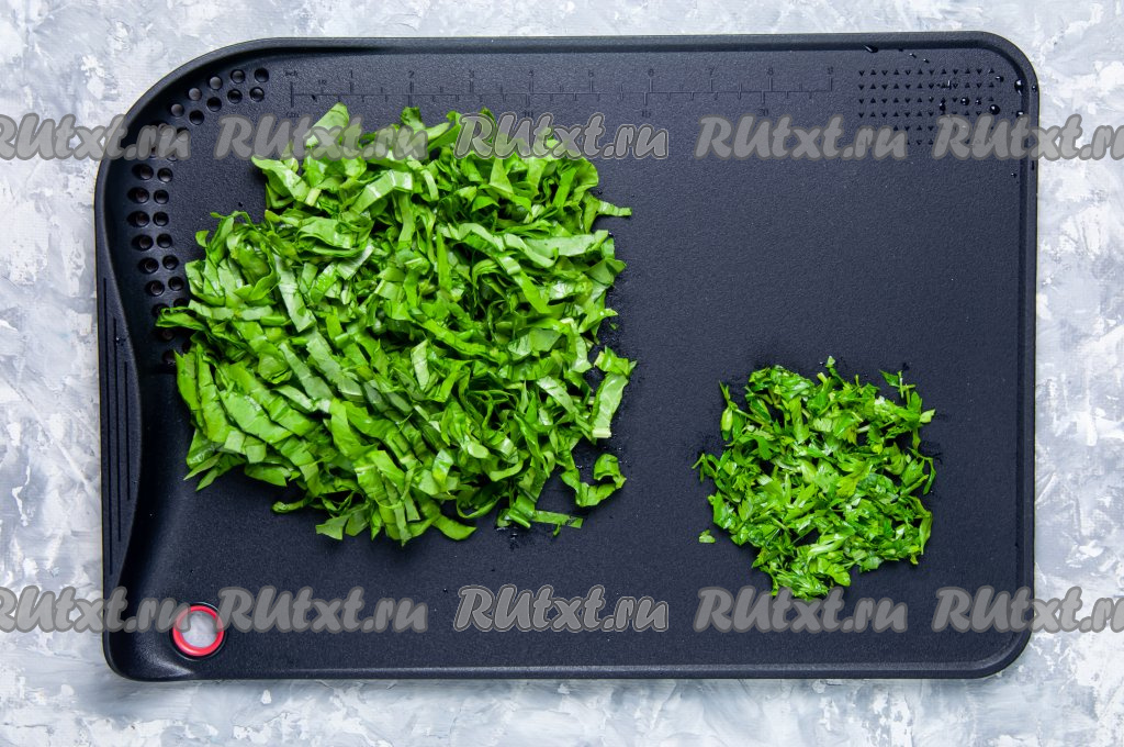 Тщательно промойте щавель и петрушку под проточной водой. Удалите черешки. Мелко нарежьте зелень.