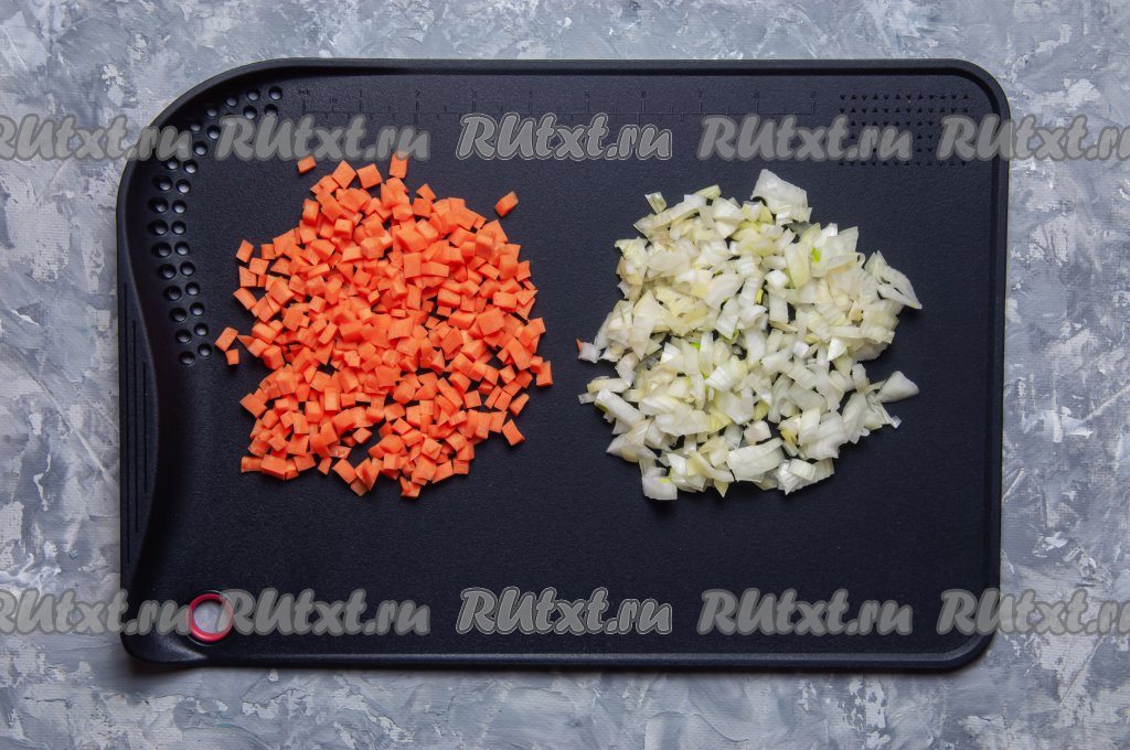 Пока варится картофель, почистите лук и морковь, помойте и нарежьте их на кубики.