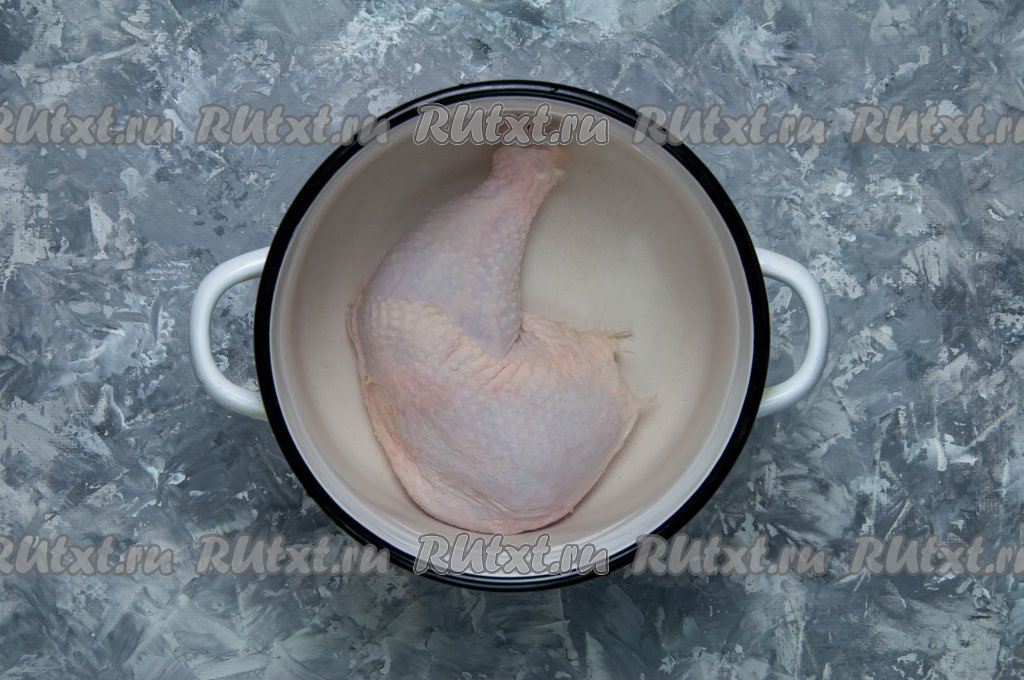 Помойте куриное мясо, положите в кастрюлю, затем залейте двумя литрами воды и поставьте на огонь.