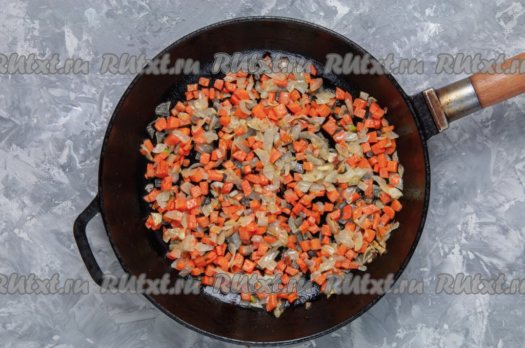 Сделайте зажарку, для этого на разогретую сковороду налейте 2 столовые ложки растительного масла, затем выложите лук с морковкой и на среднем огне обжарьте овощи в течение 7 минут (до мягкости моркови), иногда помешивая.