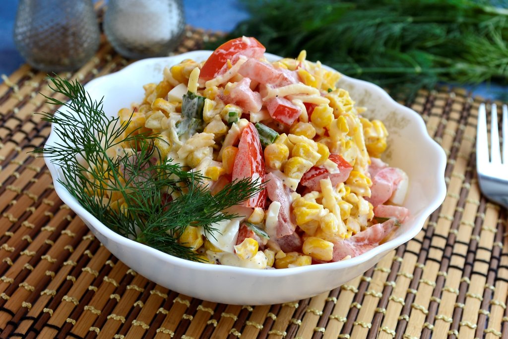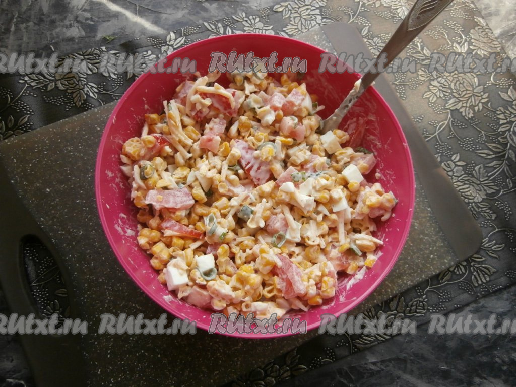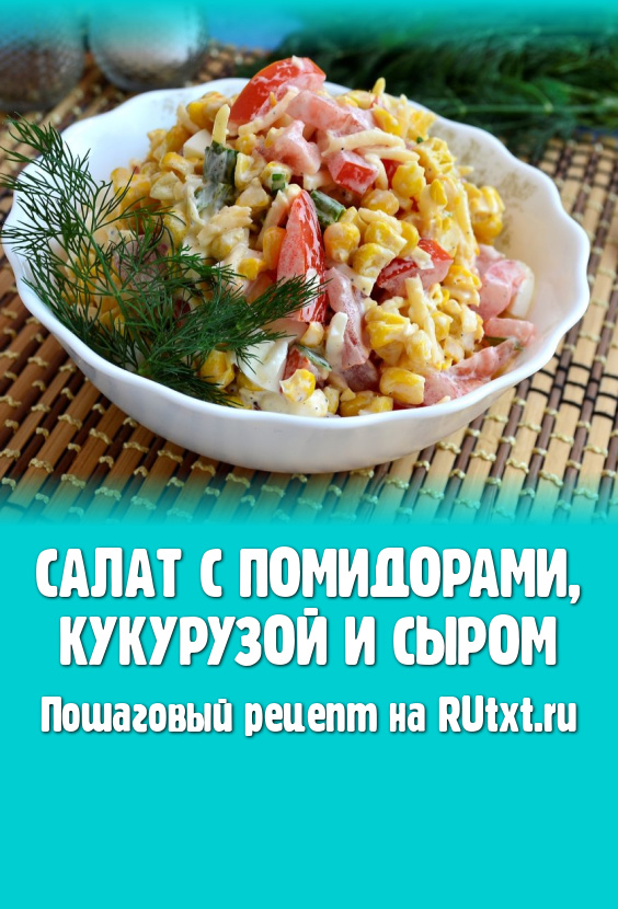 Предлагаю вам попробовать отличный салат, приготовленный с помидорами, кукурузой и сыром. Салат получается очень вкусным, сочным, сытным, он будет уместен на вашем столе и в будни, и в праздники. Для этого блюда нужно брать спелый, сладкий помидор. Попробуйте этот простой салат и насладитесь его аппетитным внешним видом и насыщенным вкусом!