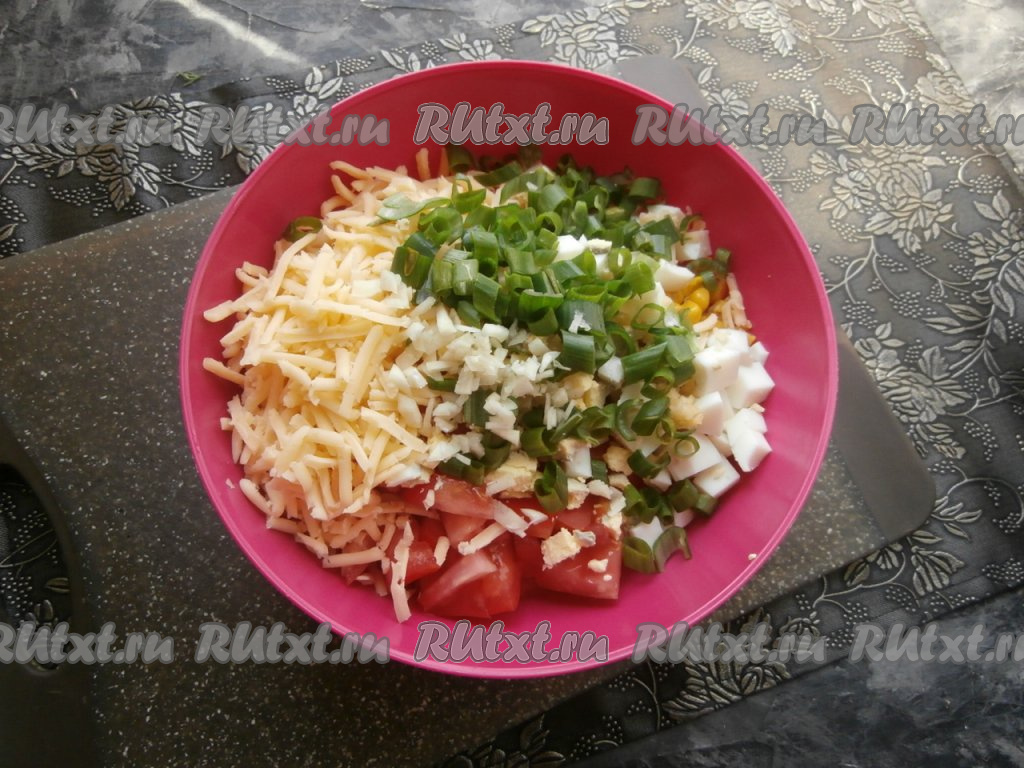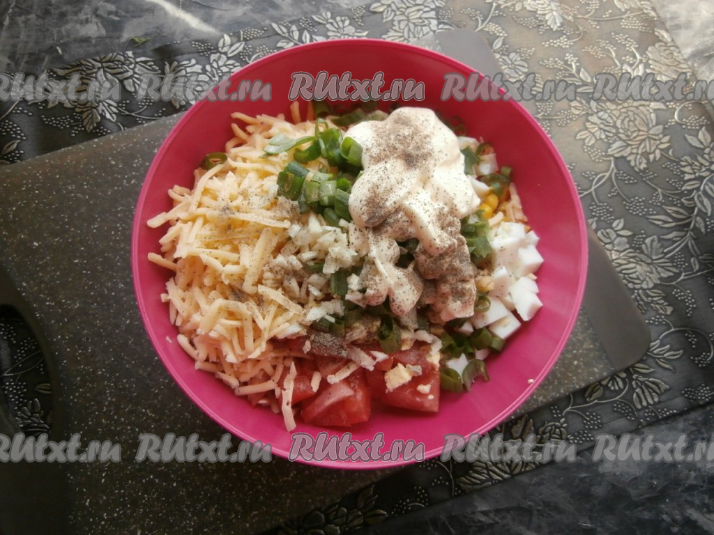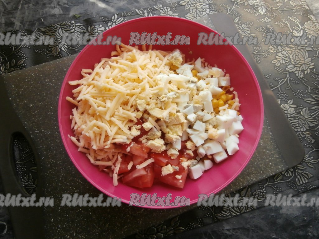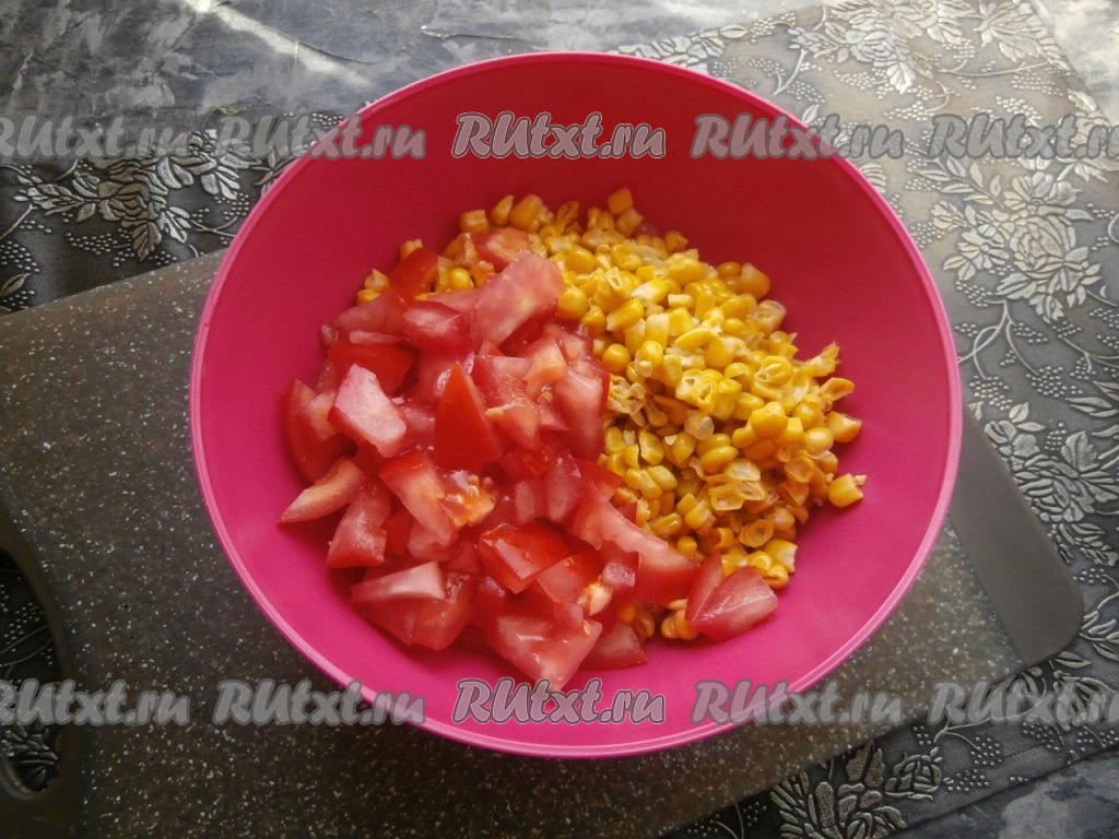 Прежде всего сварить вкрутую яйцо (на варку с момента закипания воды потребуется минут 9-10), затем залить его холодной водой, а после остывания очистить. Кукурузу поместить в миску, предварительно слив из банки жидкость, добавить нарезанный на средние кусочки свежий помидор.