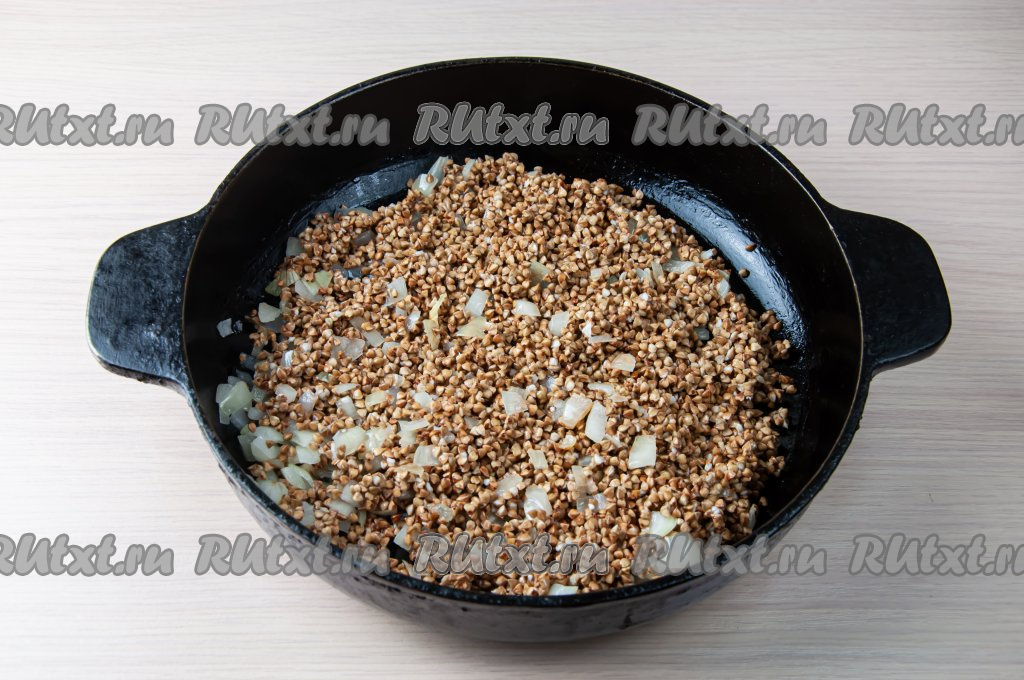 Гречку переберите, удаляя порченые зёрна, затем хорошо промойте, слейте с крупы лишнюю жидкость. К луку, обжаренному до прозрачности, добавьте подготовленную гречку, перемешайте и обжаривайте 2-3 минуты, периодически помешивая.
