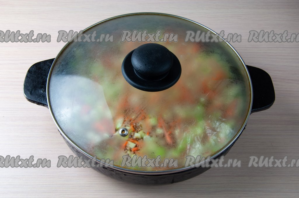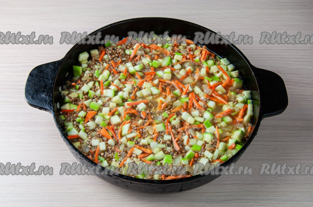 Накройте сковороду крышкой, убавьте огонь до минимума и готовьте гречку с кабачками и морковью минут 25-30 (до готовности гречки и выпаривания жидкости).