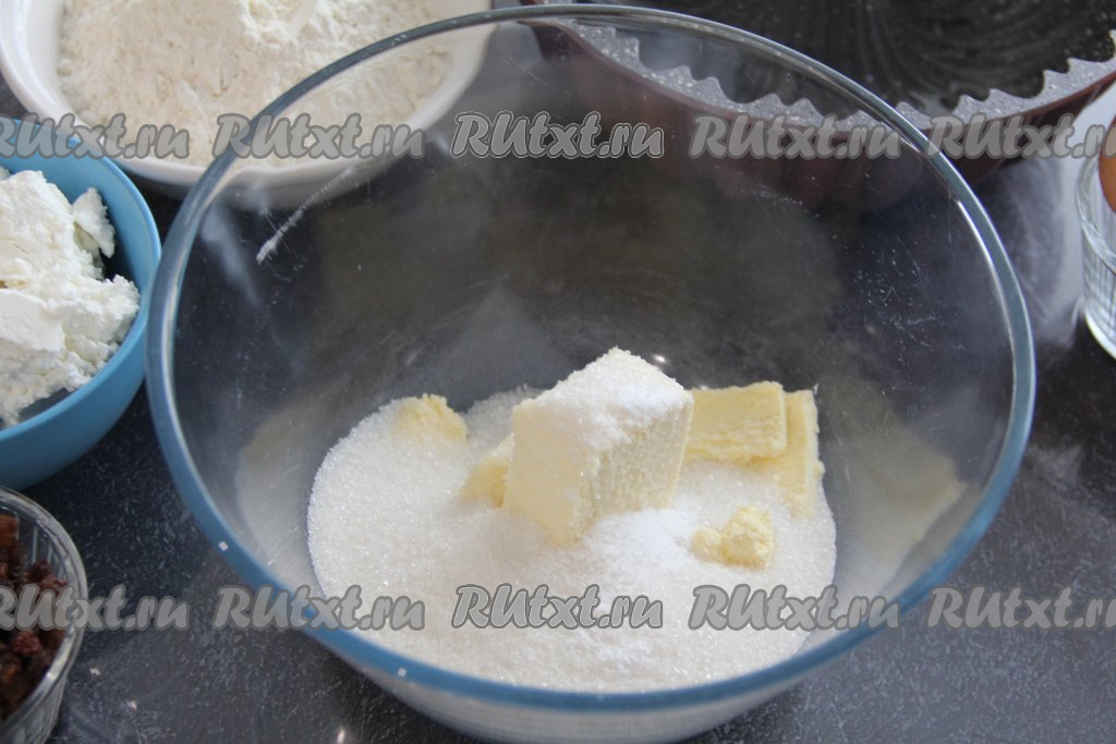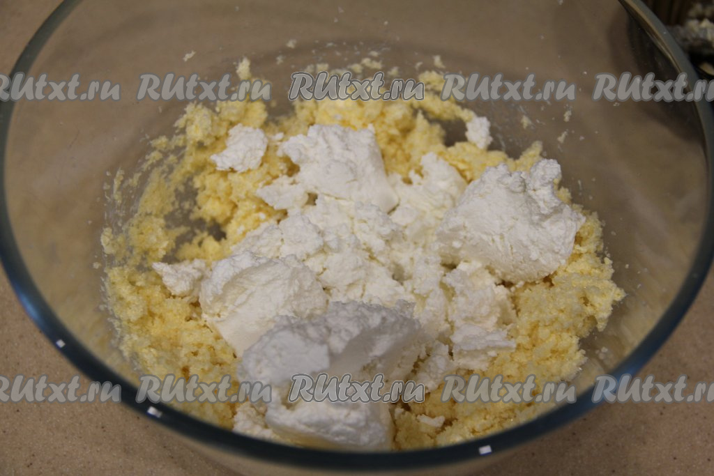 Взбить масло с сахаром миксером до однородности (в течение 2-3 минут). Затем добавить творог.