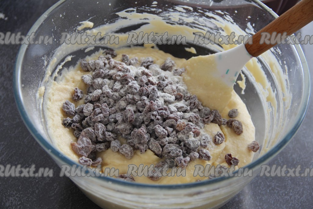 Изюм смешать с 1 чайной ложкой отложенной муки, покрывая сухофрукты мукой со всех сторон. Затем добавить изюм в творожное тесто и перемешать.