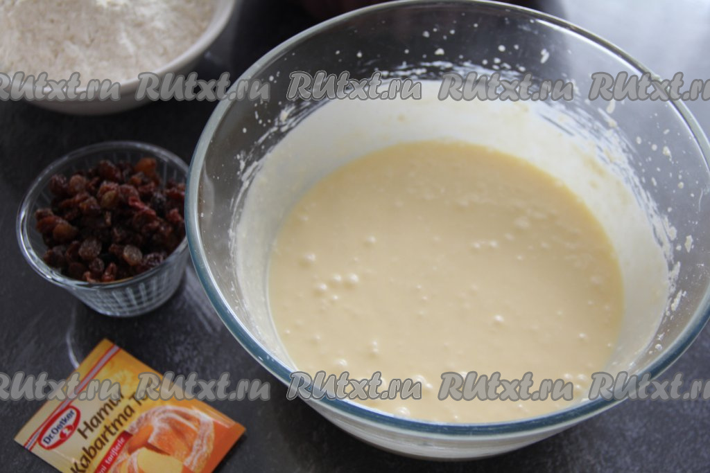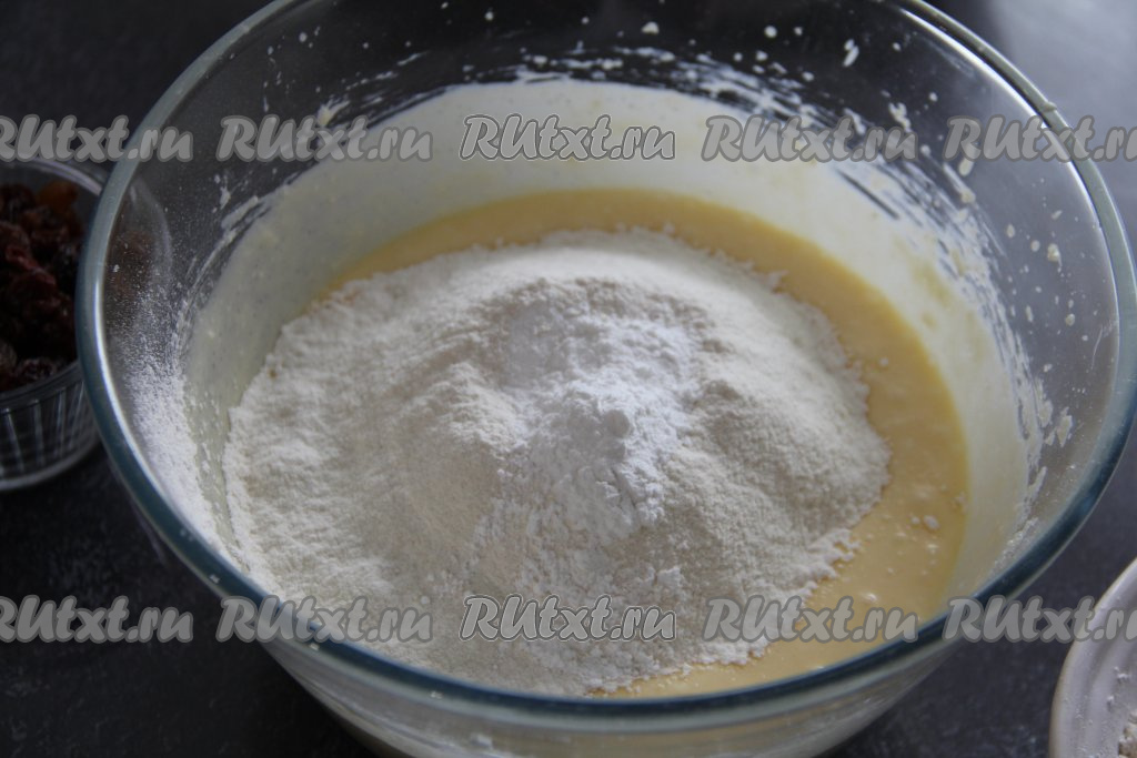 Отмерить муку, затем 1 чайную ложку муки от общей массы отложить в сторону (она нам понадобится для смешивания с изюмом). В миску всыпать просеянную муку, разрыхлитель и ванилин, перемешать тесто лопаткой (или ложкой).
