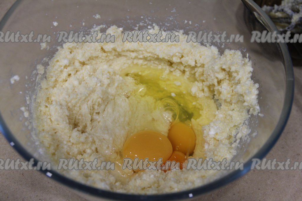Взбить творожно-масляную массу миксером до однородности. Добавить яйца.