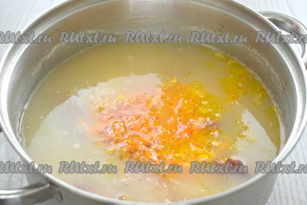 После того как картофель проварится минут 20 (станет достаточно мягким), добавляем в гороховый суп обжаренные овощи, даём закипеть и варим 5-7 минут.