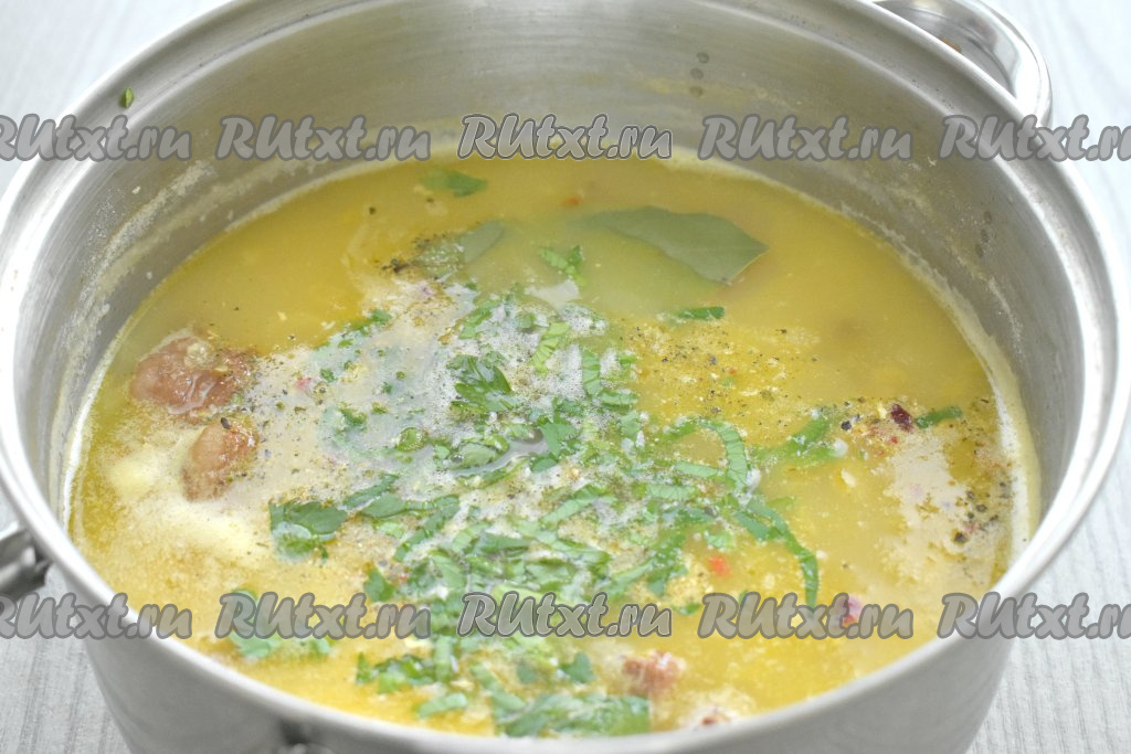 В конце приготовления пробуем суп. По вкусу его солим, добавляем молотые специи (у меня - универсальная приправа), нарезанную зелень и лавровый лист. Перемешиваем, даём закипеть и, уменьшив огонь, провариваем 2 минуты. Убираем с огня.