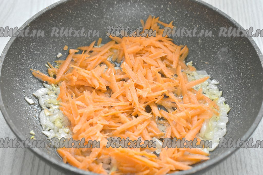 К обжаренному луку выкладываем очищенную морковку, натёртую на крупной тёрке, перемешиваем, и обжариваем овощи 4-5 минут (морковка должна стать мягкой), время от времени помешивая.