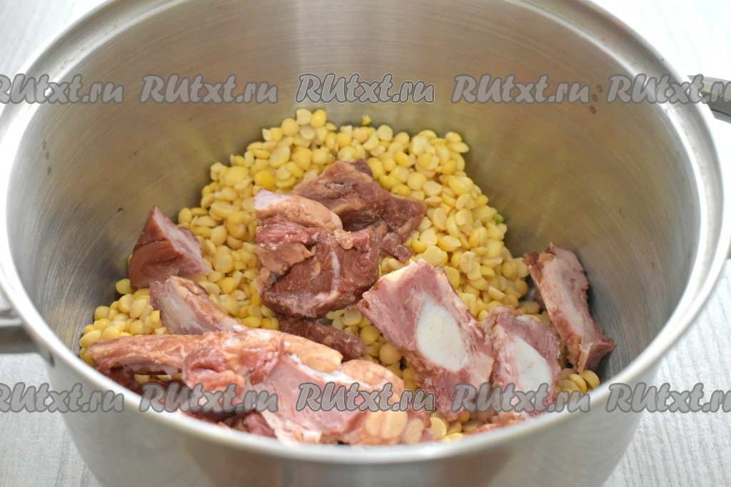 С гороха сливаем лишнюю воду, промываем его холодной водой, даём стечь лишней воде. Копчёные свиные рёбрышки и промытый горох перекладываем в кастрюлю, заливаем 2 литрами холодной воды, ставим на огонь. После закипания варим рёбрышки и горох примерно 20-25 минут (горох должен стать достаточно мягким).