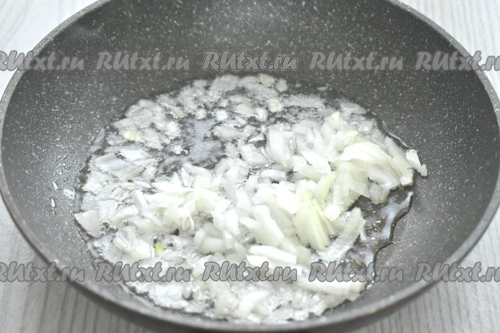Пока варится картофель, обжарим овощи. Для этого хорошо разогреваем в сковороде растительное масло, выкладываем очищенный и мелко нарезанный лук, обжариваем его, иногда помешивая, до прозрачности (минуты 3-4) на среднем огне.