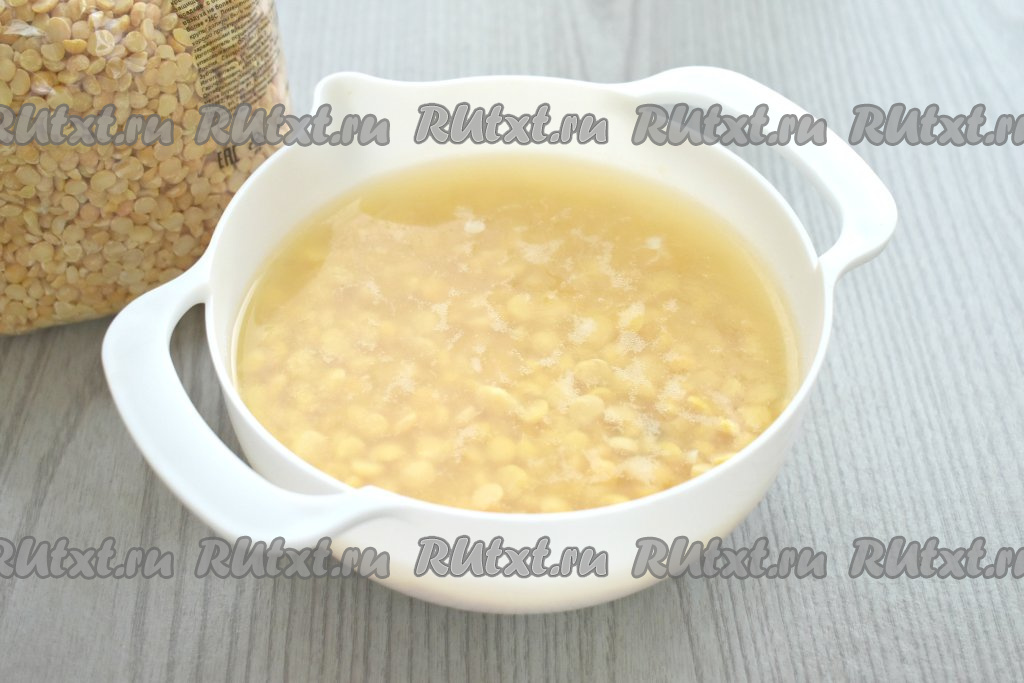 Для приготовления горохового супа я использовала колотый горох. Отмеряем нужное количество гороха, выкладываем в миску, полностью заливаем холодной водой и оставляем на ночь. Благодаря замачиванию гороха, время варки супа заметно сократится.