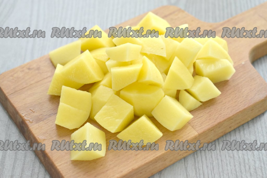 После того как горох станет достаточно мягким, выкладываем в кастрюлю очищенный картофель, нарезанный на кубики, даём закипеть, уменьшаем огонь и варим гороховый суп с копчёными рёбрышками минут 20 (картошка должна стать достаточно мягкой).