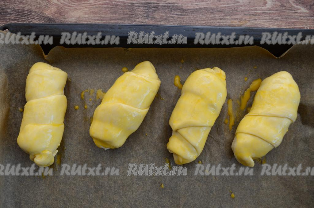 Сырое яйцо в небольшой ёмкости взболтать вилкой до однородности. Смазать взбитым яйцом каждую булочку.