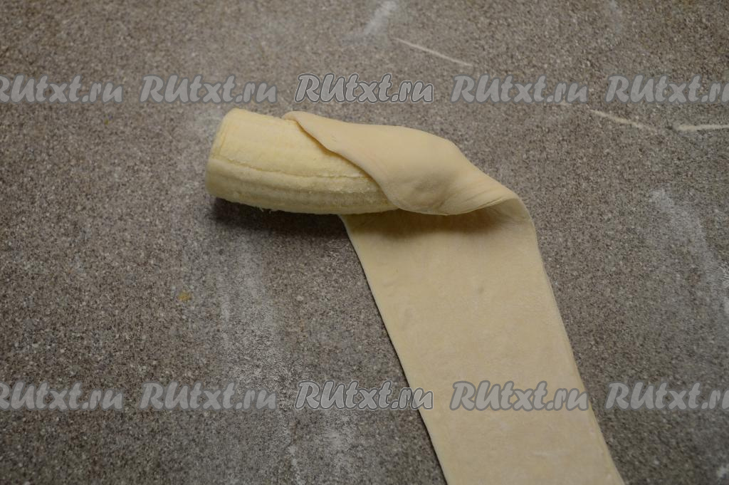 Очистить банан, разрезать на 2 примерно равные части. Начиная с узкого края банана, начать заворачивать банан в раскатанную полоску теста, как на фото.