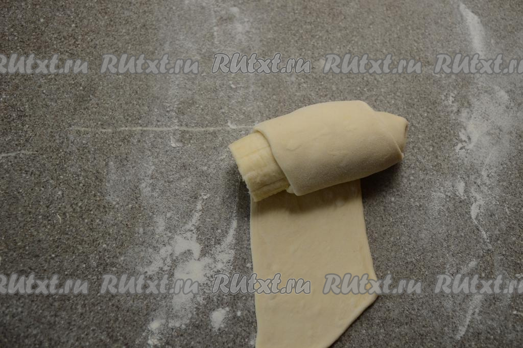 Пласт слоёного теста, не раскатывая, на слегка присыпанной мукой поверхности разрезать на 4 одинаковых полоски.