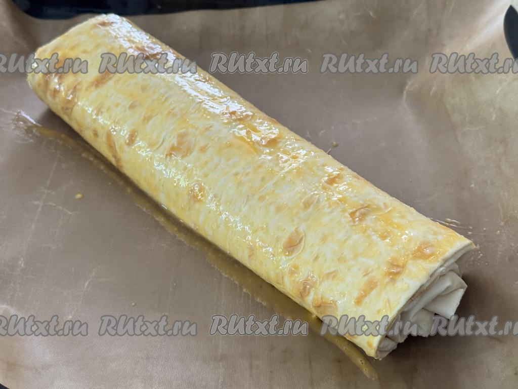 Отложенный ранее яичный желток взбить вилкой до однородности. Рулет из лаваша смазать сверху взбитым желтком.