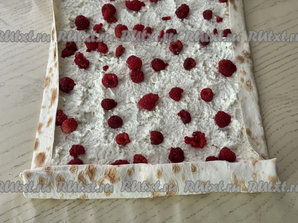 Немного подвернуть вначале боковые края лаваша на начинку, а затем, начиная с более узкого края, свернуть лаваш с творожно-ягодной начинкой в рулет.