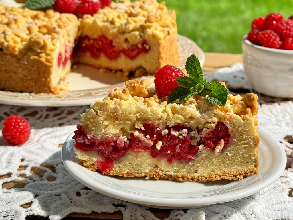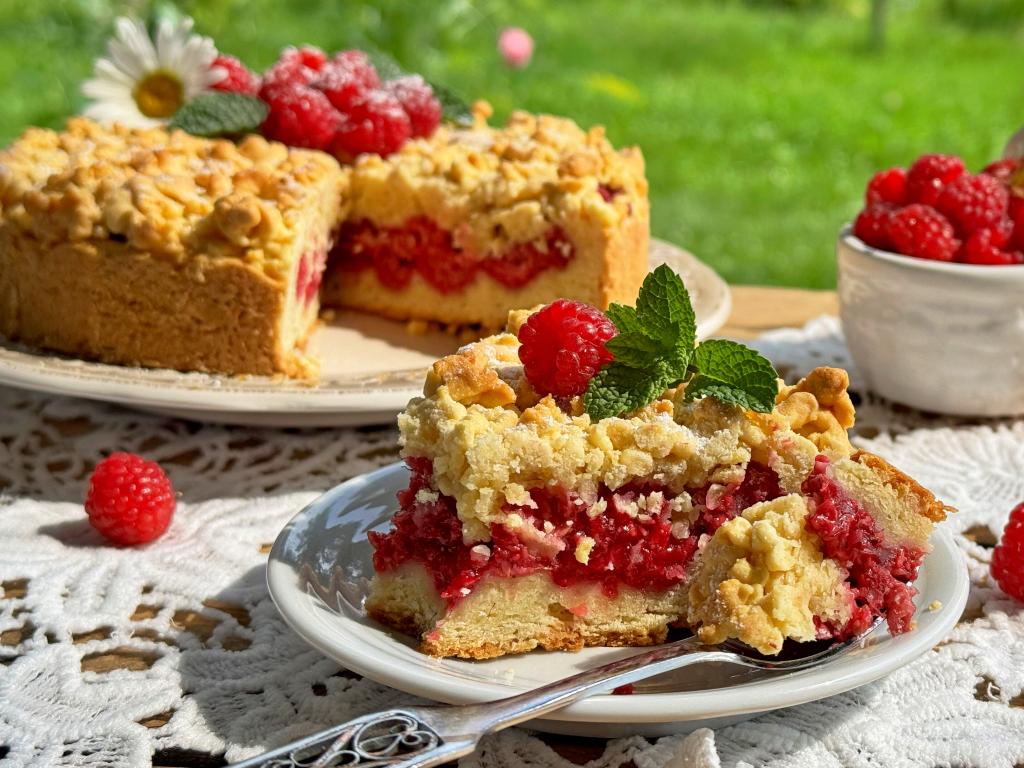 Нежный, вкусный тёртый пирог с яркой, сочной начинкой из малины нарезать на кусочки и подать к столу.