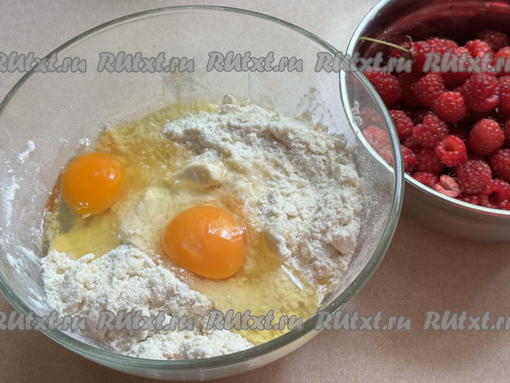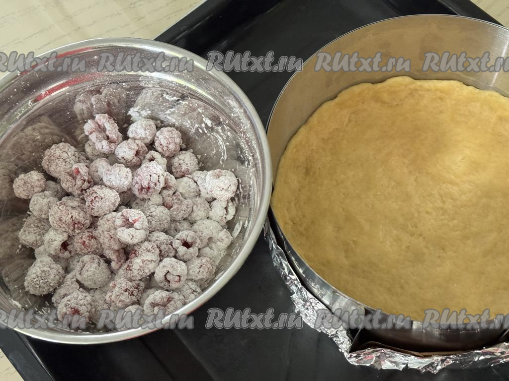 Выложить малину в форму поверх теста.