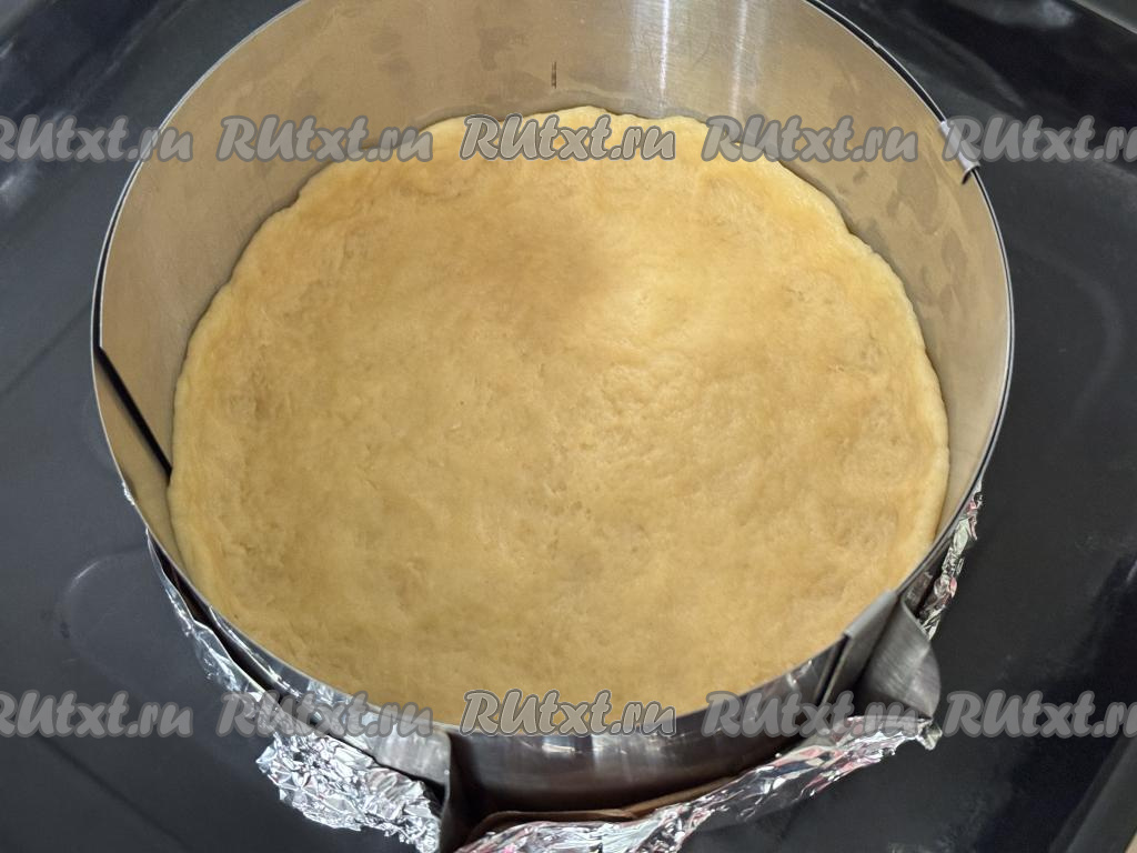 Взять разъёмную форму для выпечки диаметром 20 сантиметров (вместо формы я использовала разъёмное кольцо диаметром 20 сантиметров, сформировав дно из пергамента и фольги, сложенной в несколько слоёв). Достать тесто из холодильника, равномерно распределить его по дну форму, сформировав бортик высотой примерно 1 сантиметр.