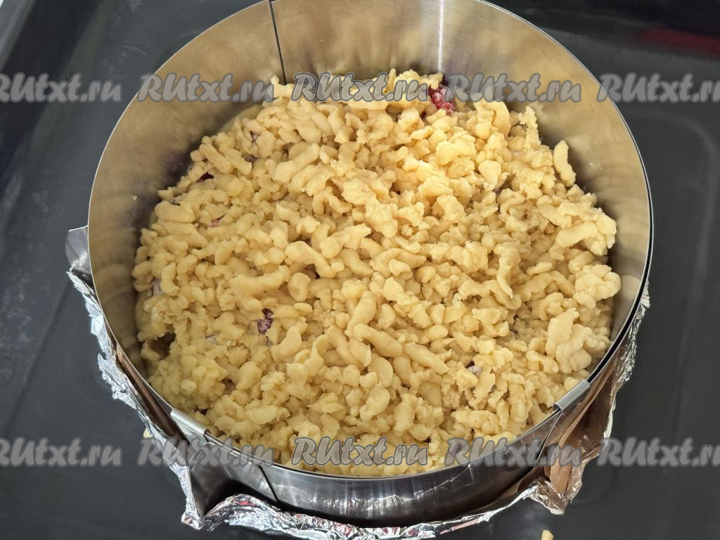Достать вторую часть теста из морозилки, натереть его на крупной тёрке. Натёртое тесто равномерно распределить поверх ягод.