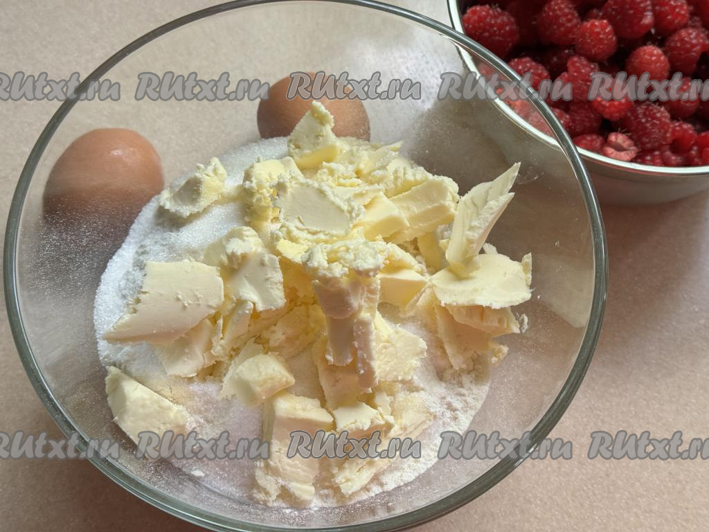Сливочное масло достать из холодильника, нарезать на кусочки, добавить в миску с сухими ингредиентами.