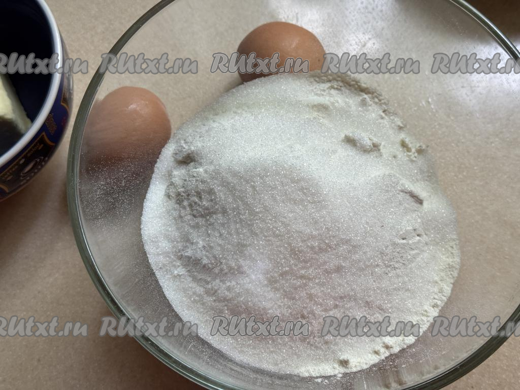 Прежде всего замесим песочное тесто, для этого в объёмную миску нужно всыпать 200 грамм просеянной муки, сахар, разрыхлитель и соль, перемешать сухие ингредиенты.