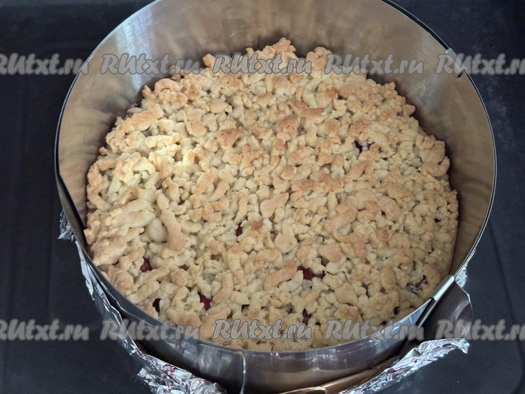 Достать выпечку из духовки, остудить пирог в форме, а затем снять бортики формы.