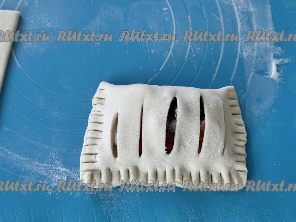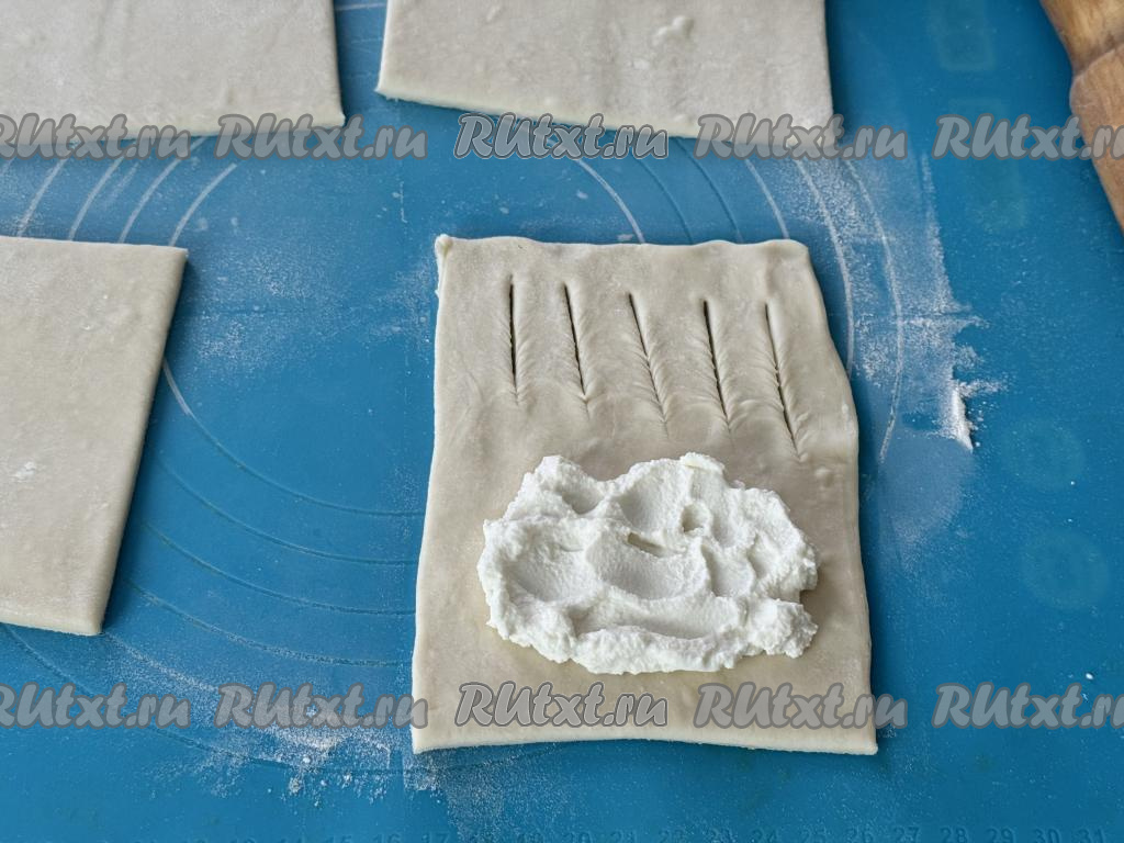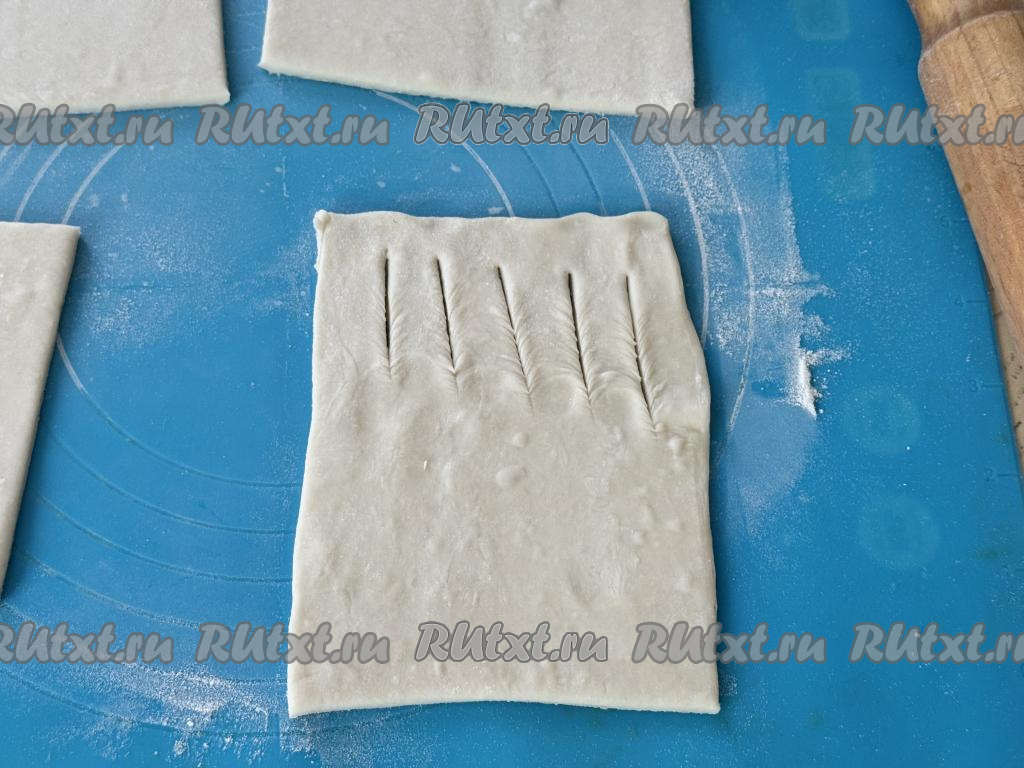 Затем каждый квадрат раскатать в прямоугольник. Зрительно разделить раскатанный прямоугольник на две одинаковых части. На одной узкой части получившегося прямоугольника сделать 4-5 разрезов острым ножом (как на фото), отступая от краёв теста по 1-1,5 сантиметра.