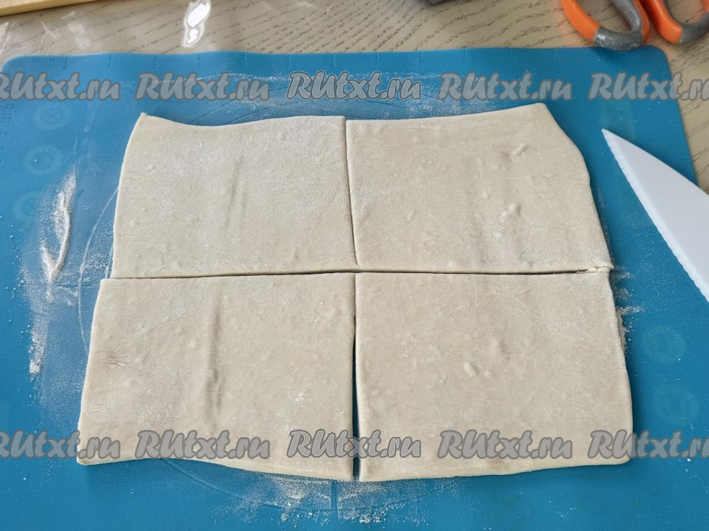 Слоёное тесто у меня было в двух пластах. Вначале на припылённой мукой поверхности раскатать один пласт теста примерно до толщины 3 миллиметра. Раскатанный пласт теста разрезать на 4 части, получатся 4 квадратных заготовки. Второй пласт теста аналогично раскатать и тоже разрезать на 4 части. В результате из двух пластов теста получатся 8 квадратов (то есть мы будем формировать 8 слоек).