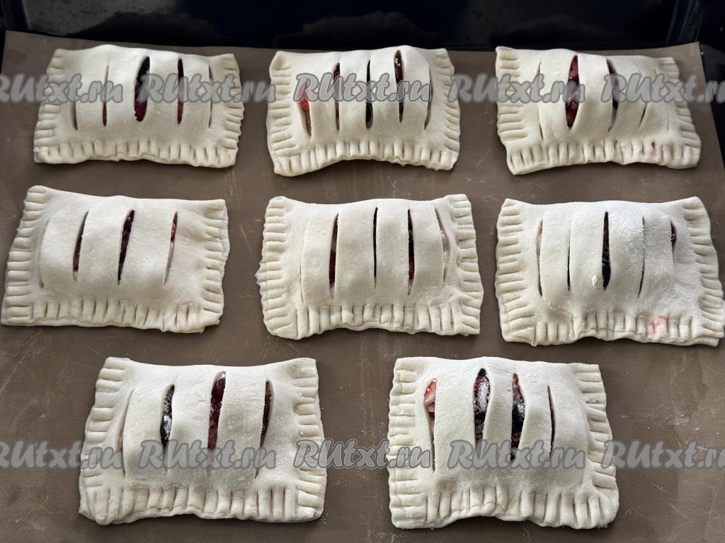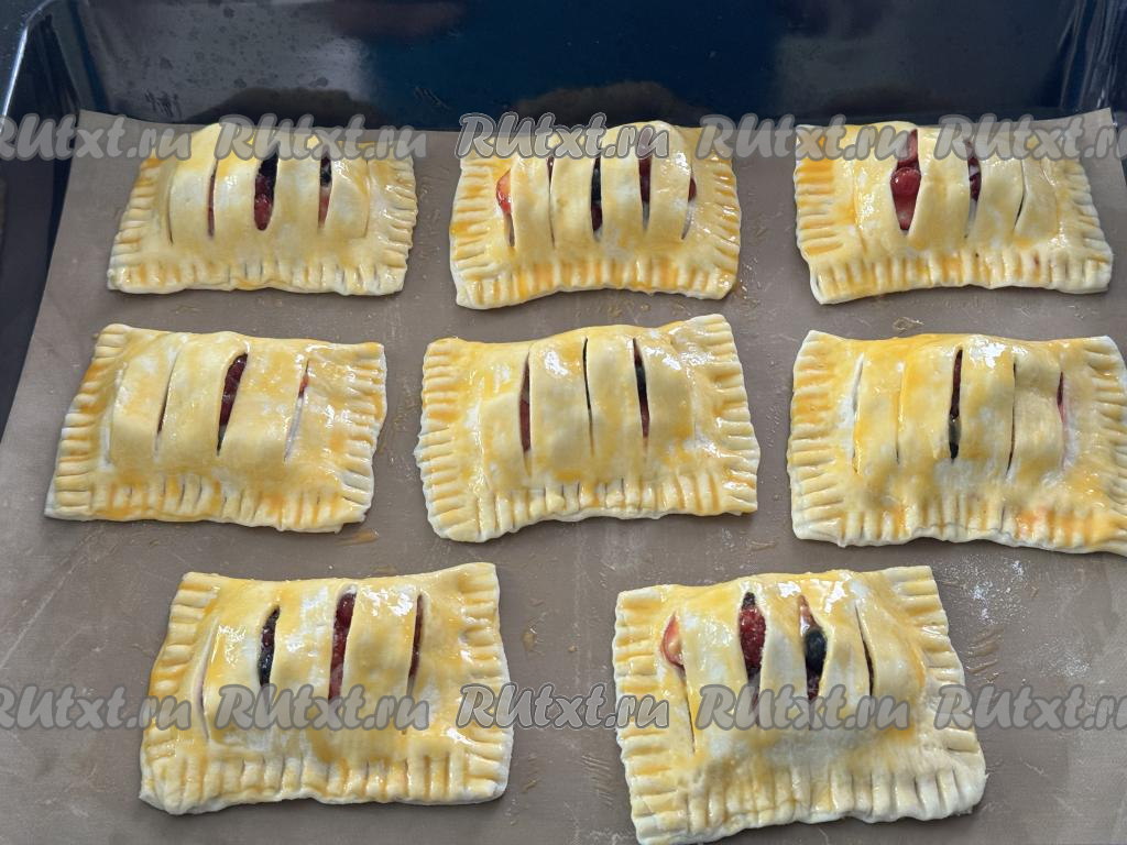 Выпекать слойки с ягодами и рикоттой минут 20-25 (до приятного золотистого оттенка слоёного теста).