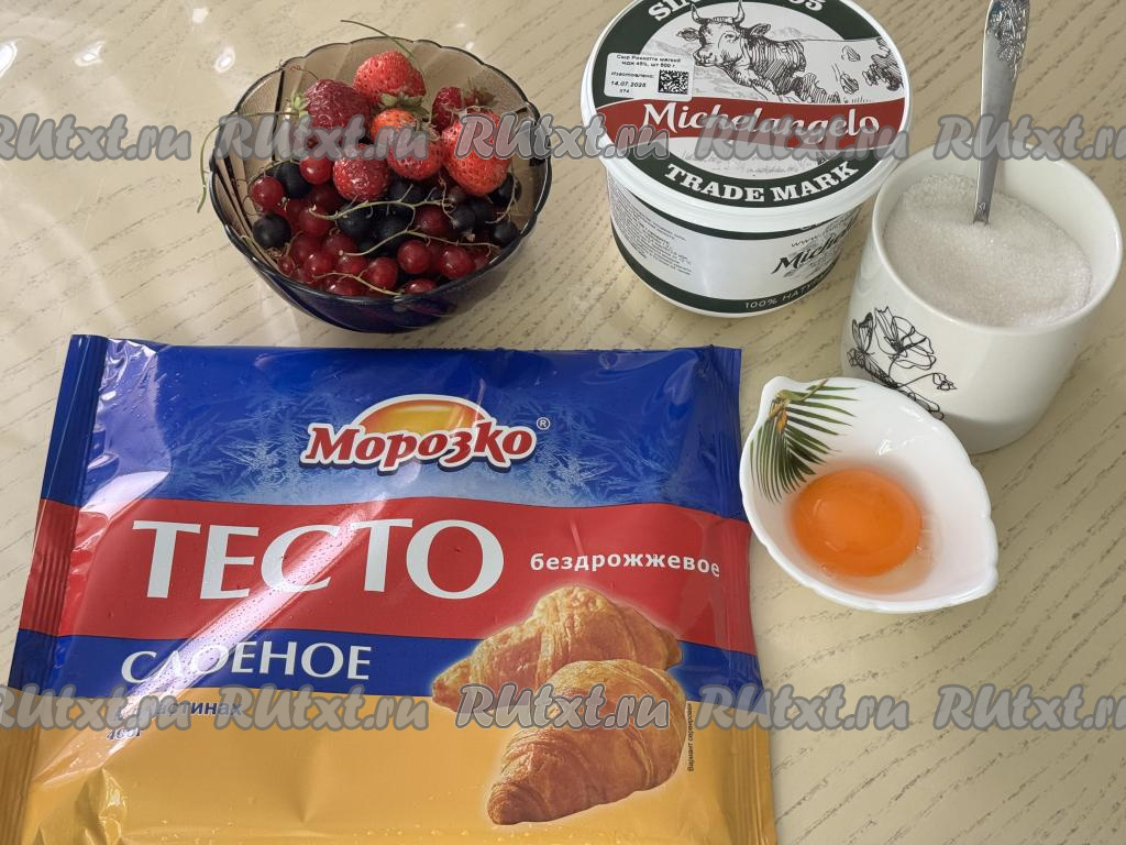 Подготовить продукты. Слоёное тесто можно взять как дрожжевое, так и бездрожжевое, его нужно разморозить при комнатной температуре. У меня было бездрожжевое слоёное тесто. Ягоды можно взять любые свежие или замороженные. Я взяла свежие ягоды: чёрную и красную смородину, а также малину и клубнику. Свежие ягоды нужно промыть водой, убирая веточки, обсушить. Если ягоды с крупными косточками (например, черешня или вишня), тогда косточки нужно удалить. Если будете использовать замороженные ягоды, на которых нет большого количества льда, значит их можно не размораживать.
