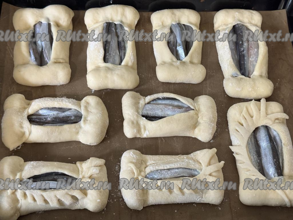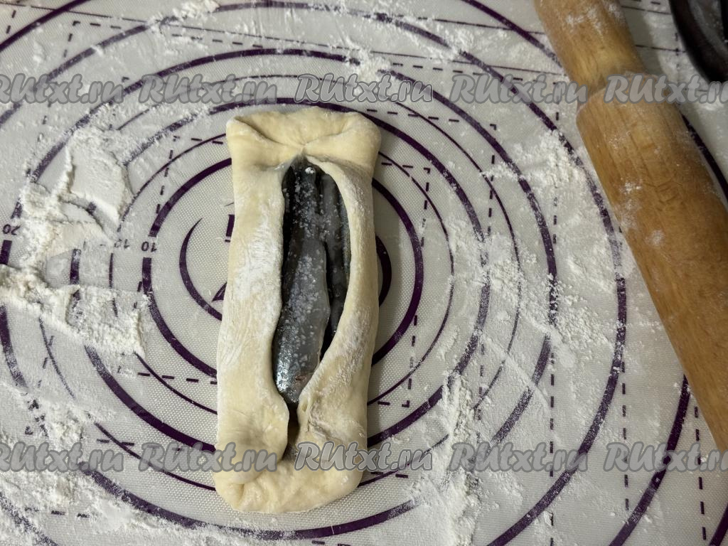 Разделить тесто на 10 частей. У нас получатся 9 пирожков с мойвой и одну часть теста будем использовать для формирования украшения. Каждую часть теста слегка раскатать скалкой в овал, выложить в середину 3-4 рыбки.