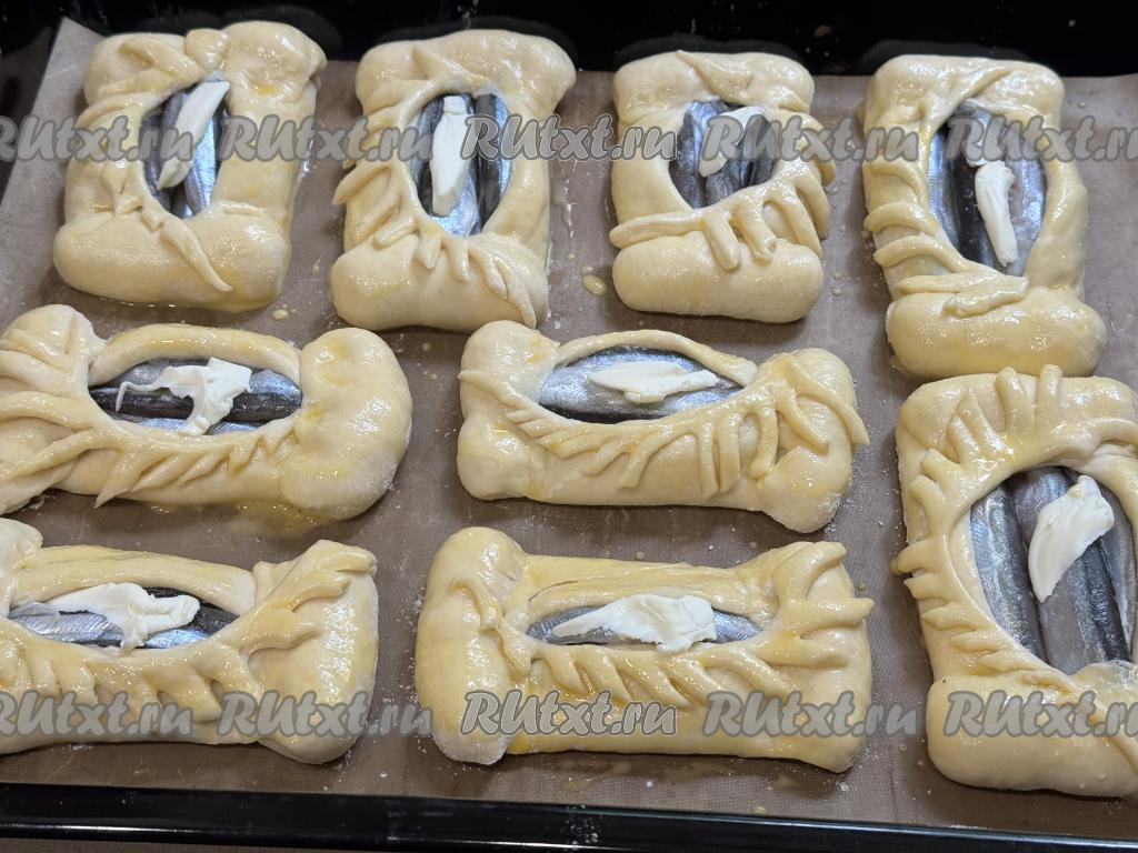 В центр каждого пирожка поверх рыбы выложить грамм 10 сливочного масла. Поставить противень с открытыми пирожками с мойвой в духовку, разогретую до 200 градусов.