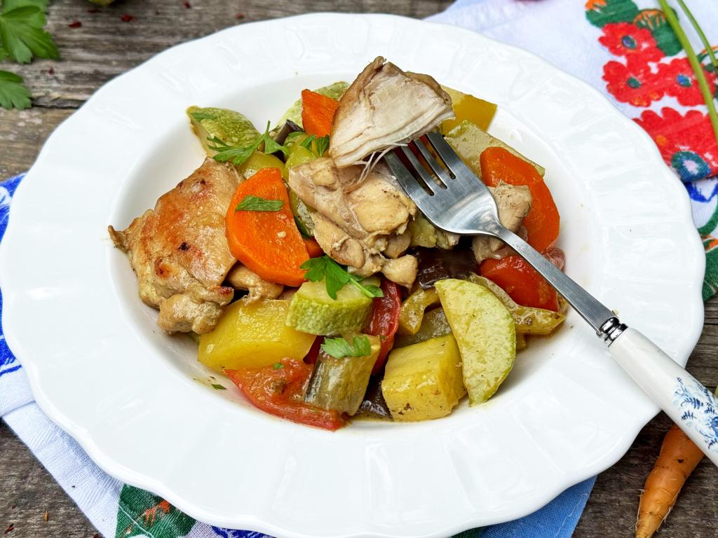 Готовность проверять по картошке, она должна легко прокалываться ножом. Готовое блюдо попробовать на соль, если нужно, можно досолить и перемешать овощи с курицей.
