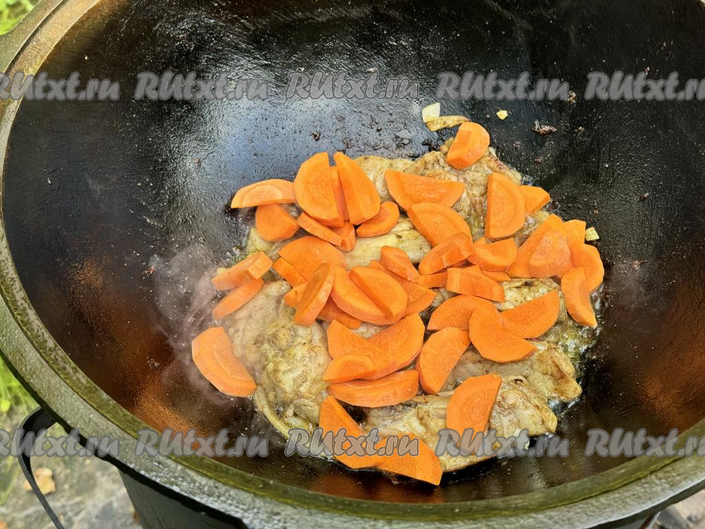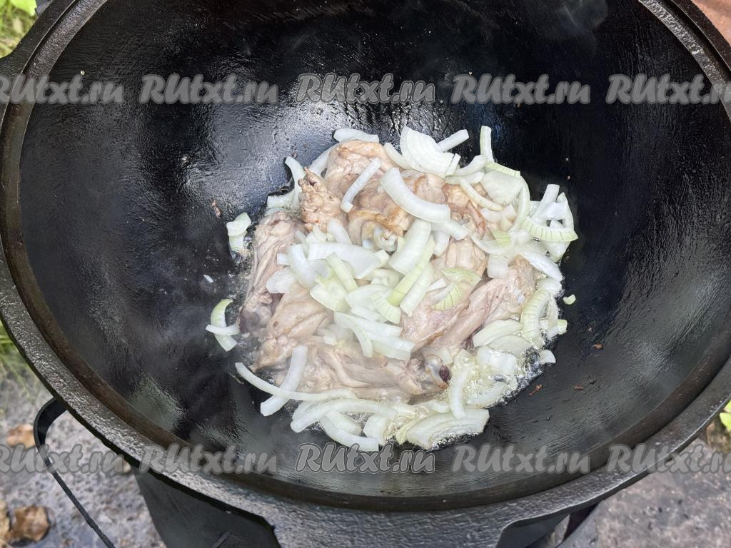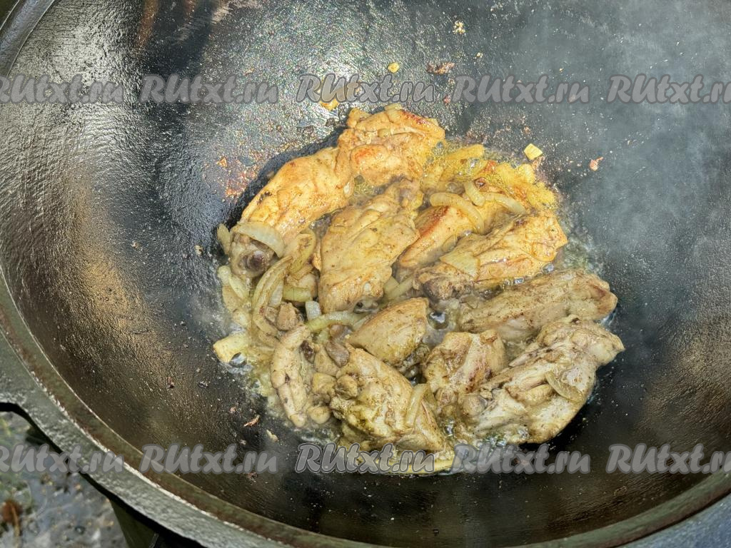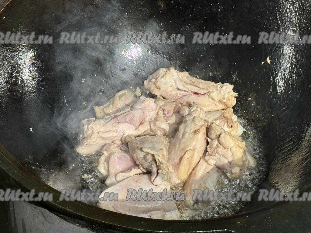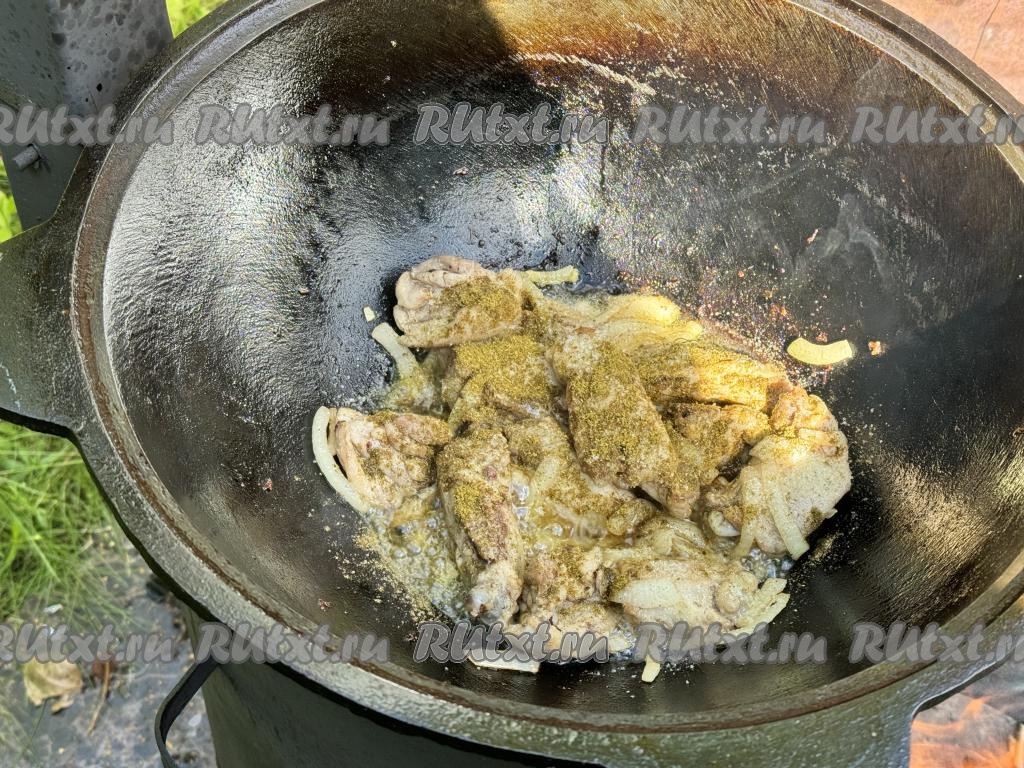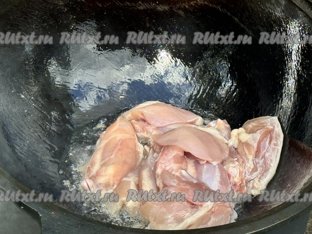 Казан поставить на костёр, влить растительное масло. Разогреть масло в течение 3-5 минут, затем выложить в казан кусочки курицы.