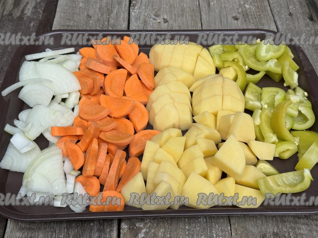 Лук, морковь и картошку очистить. Из болгарского перца удалить плодоножку, семена, крупные перегородки. Промыть водой лук, морковку, картофель и перец, нарезать их на средние кусочки (мелко нарезать не нужно).